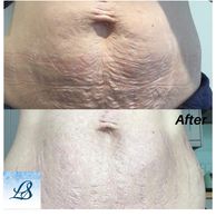 Tiny dark brown spots/scabs are evident after treatment or there may be an appearance of a burn in areas where skin blasting (removal) has taken place.